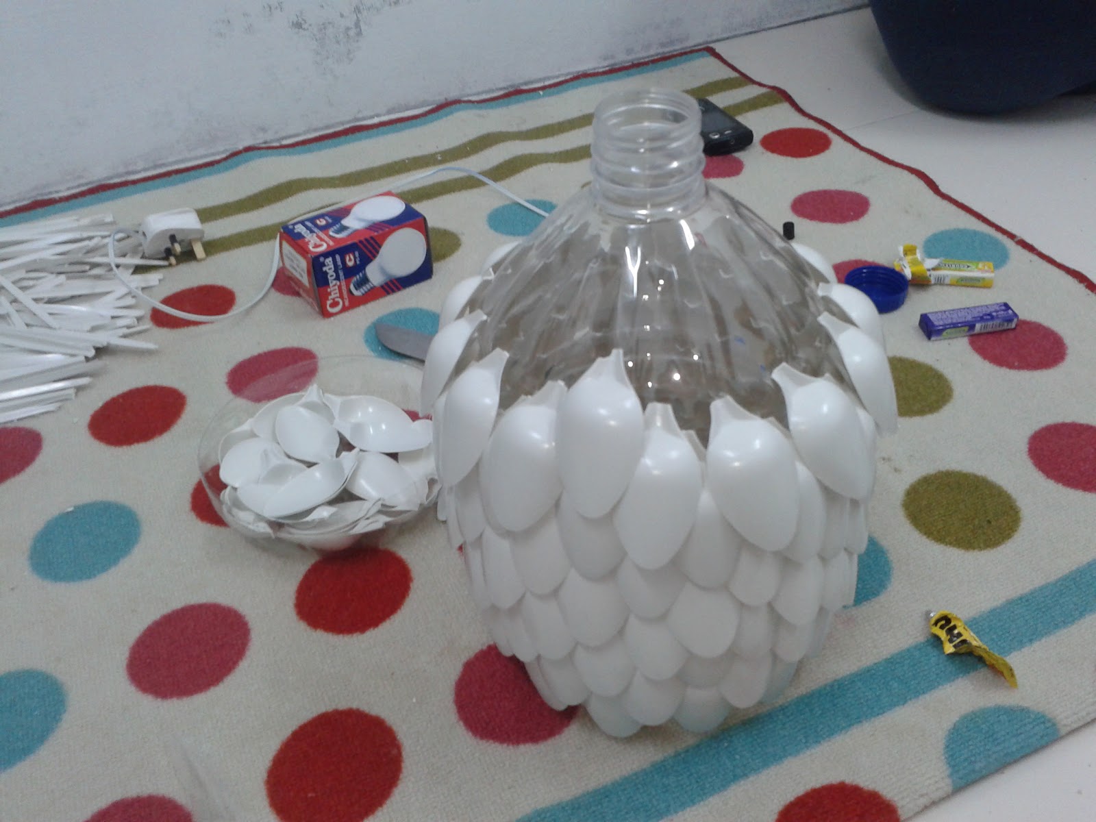 pasal lampu yang dibuat dari botol air dan sudu plastik.